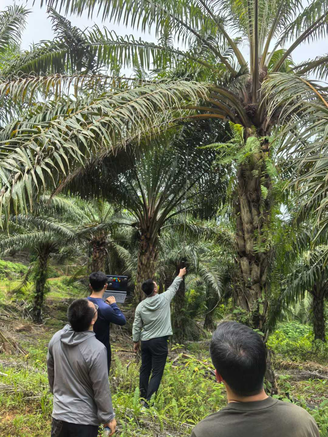 棕榈种植与其他作物最大的不同,是它的高度和密度。一棵棕榈树可以长到 10 米以上,果实成串生长,藏在厚重的枝叶之间。传统采摘完全依赖人工——工人爬上树、用长杆砍下果串,危险、低效、且越来越难招到人。